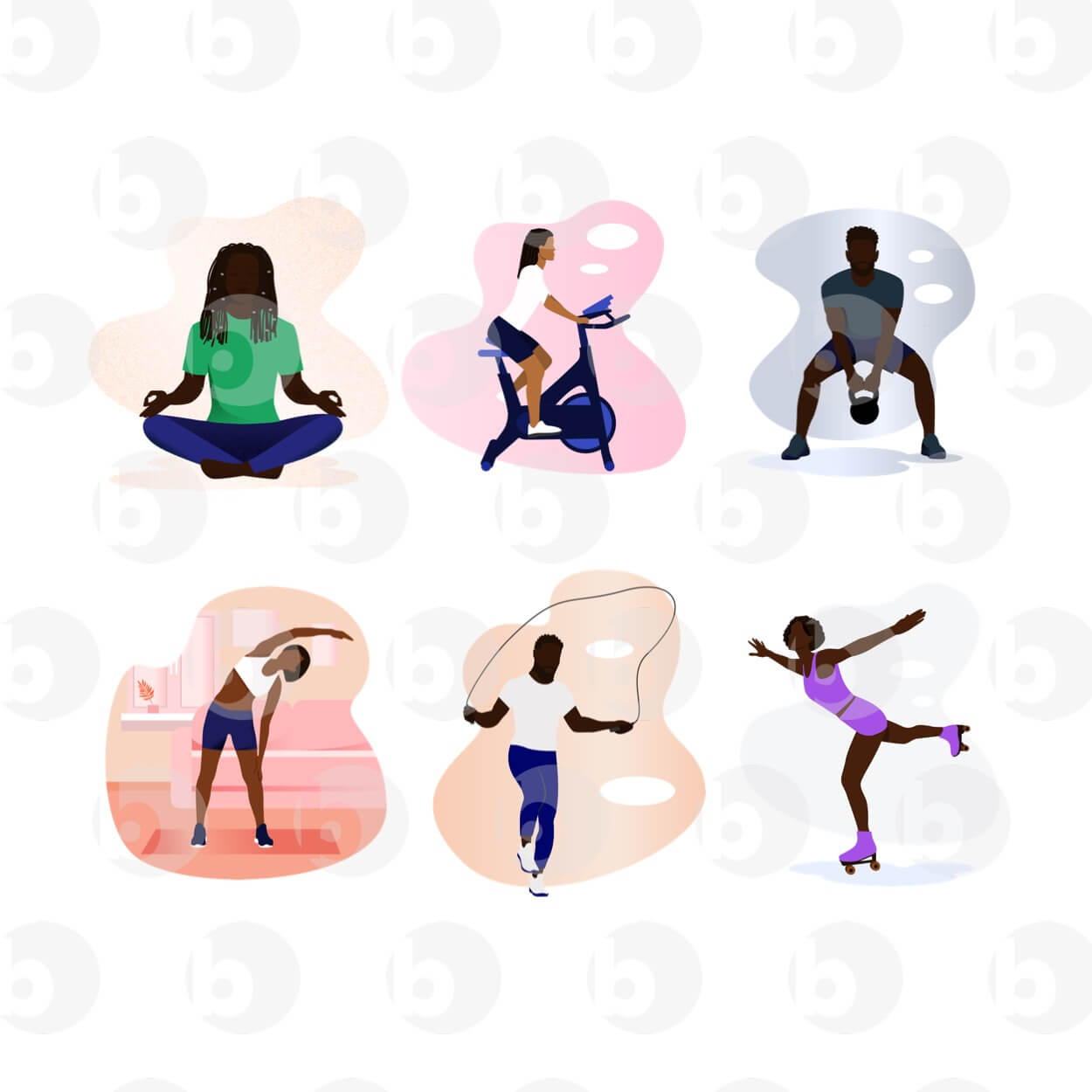 We've got illustrations of Black people doing exercises such as stationary bike riding, jogging, kettle bell swing, mediation, rollerblading and with a personal trainer.